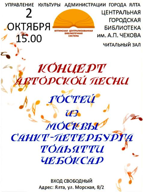 2 октября в 15:00 в читальном зале Центральной городской библиотеки имени А.П. Чехова состоится концерт авторской песни, в программе которого прозвучат песни современных авторов. Перед ялтинцами, любителями современной авторской песни, выступят авторы-исполнители из разных городов России: Москвы, Санкт-Петербурга, Тольятти и Чебоксар.
