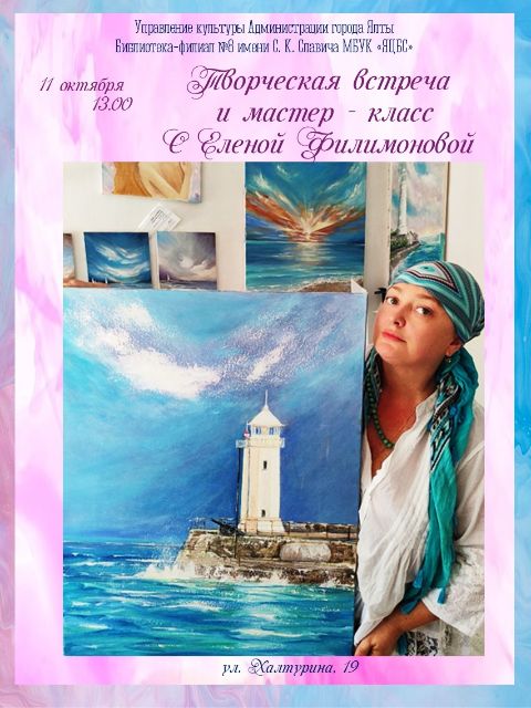 11 октября в 13:00 в библиотеке-филиале № 8 имени С.К. Славича состоится творческая встреча с Еленой Филимоновой, членом Союза русских художников, лауреатом Всероссийских и Международных конкурсов и выставок, которая проведёт мастер-класс «Золотые паруса». Всех желающих принять участие в мастер-классе просим предварительно записаться по телефону +79787387063.