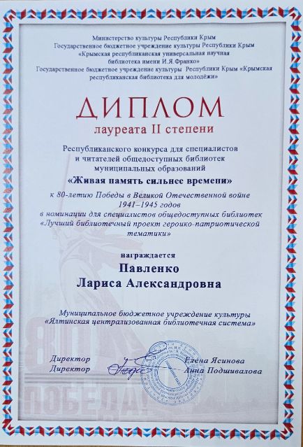 Детская городская библиотека получила Диплом второй степени в Республиканском конкурсе «Живая память сильнее времени» для библиотечных специалистов и читателей общедоступных библиотек муниципальных образований. Поздравляем коллег с заслуженным признанием, желаем дальнейшего профессионального развития и призовых мест в конкурсах профессионального мастерства!