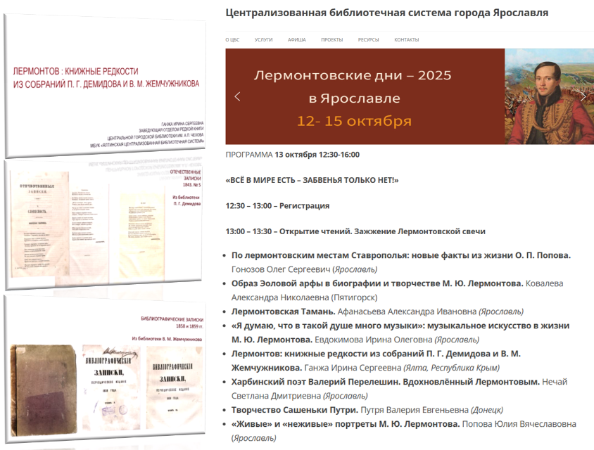 Центральная городская библиотека имени А.П. Чехова приняла онлайн-участие в ХХV Лермонтовских чтениях, проходивших 13-14 октября в Центральной библиотеке имени М.Ю.Лермонтова муниципального учреждения культуры «Централизованная библиотечная система города Ярославля», с видеодокладом «Лермонтов: книжные редкости из собраний П.Г. Демидова и В.М. Жемчужникова».