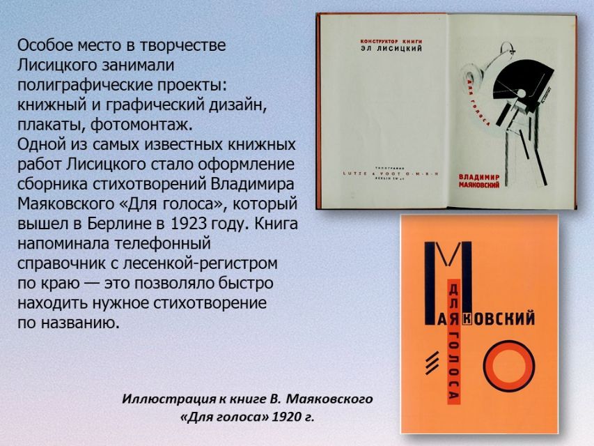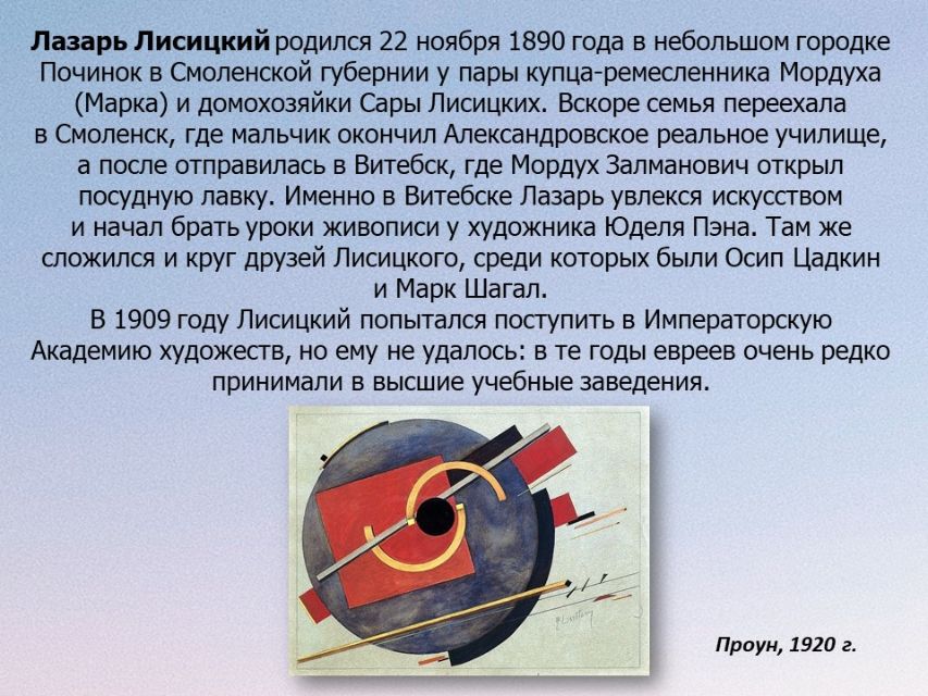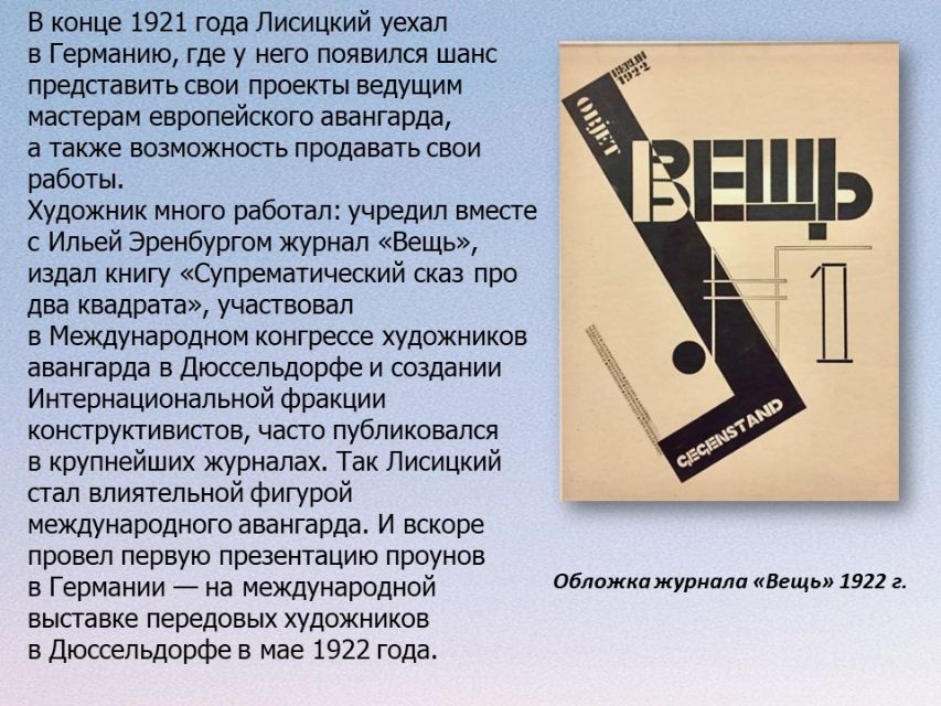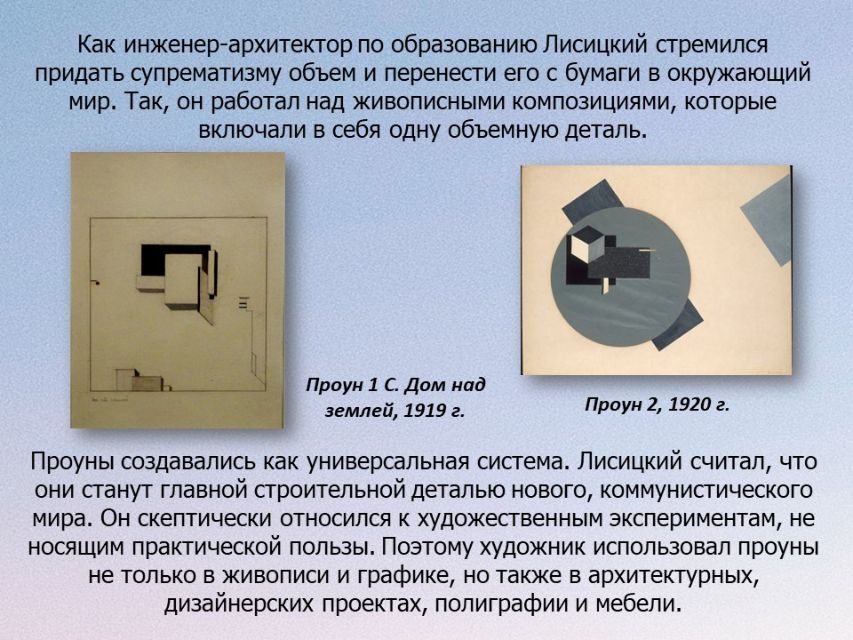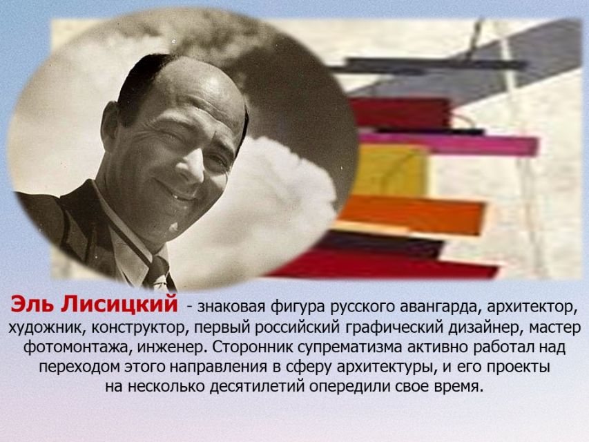 Именно идеи Э Лисицкого могут помочь создать новое искусство для нового общества, способное изменить среду, сознание и жизнь человека.