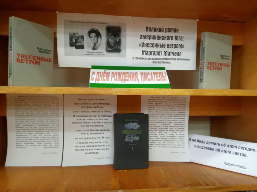 В библиотеке-филиале № 21 (пгт. Форос) подготовили тематическую полку "Великий роман американского Юга: "Унесённые ветром" Маргарет Митчелл", посвящённую 125-летию со дня рождения американской писательницы и журналистки, автора единственного и культового романа, ставшего легендой и откликнувшегося в миллионах сердец читателей.