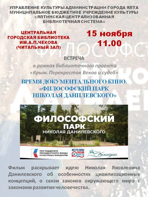 15 ноября в 11:00 в читальном зале Центральной городской библиотеки имени А.П. Чехова в рамках цикла познавательных встреч библиотечного проекта "Крым. Перекрёсток веков и судеб" состоится встреча "Время документального кино. "Философский парк Николая Данилевского".