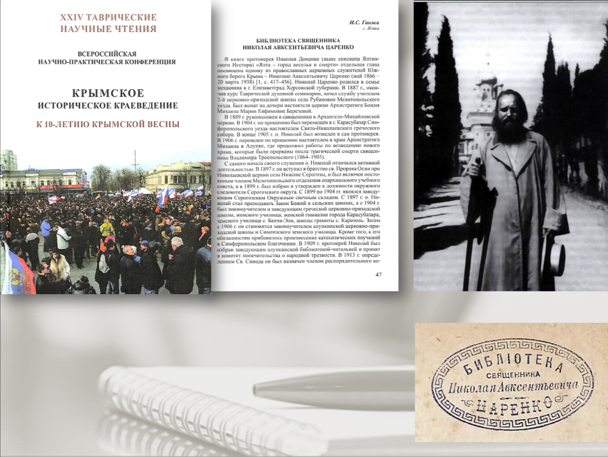 В 2025 году был издан сборник по материалам Всероссийской научно-практической конференции «Таврические чтения» (10-11 октября 2024 г., Центральный музей Тавриды, г. Симферополь), в котором была опубликована статья «Библиотека священника Николая Авксентьевича Царенко», в которой заведующая отделом редкой книги И.С. Ганжа рассказала о судьбе настоятеля храма Архангела Михаила в Алупке и части его книжного собрания, которое хранится в редком фонде.