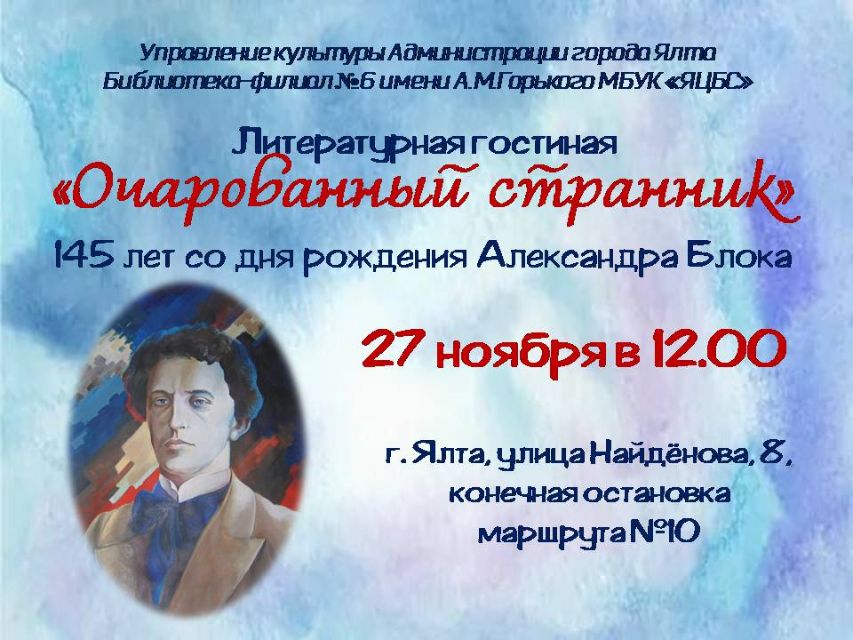 Библиотека-филиал № 6 имени А.М.Горького приглашает поклонников поэзии Александра Блока на встречу в Литературной гостиной, которая состоится 27 ноября в 12:00. Будем говорить о жизни поэта, как о яркой вспышке - стремительном взлёте, ранней славе, десятках хрестоматийных строк.