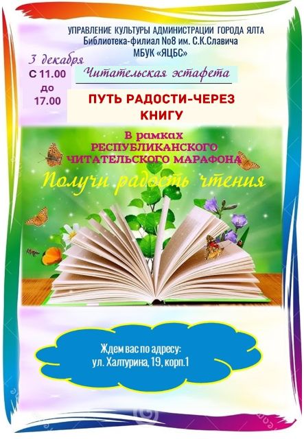 3 декабря в течение всего дня библиотека-филиал № 8 имени С.К.Славича приглашает окунуться в атмосферу литературного праздника в рамках Республиканского читательского марафона "Получи радость чтения"! Присоединяйтесь к марафону - откройте для себя радость чтения!
