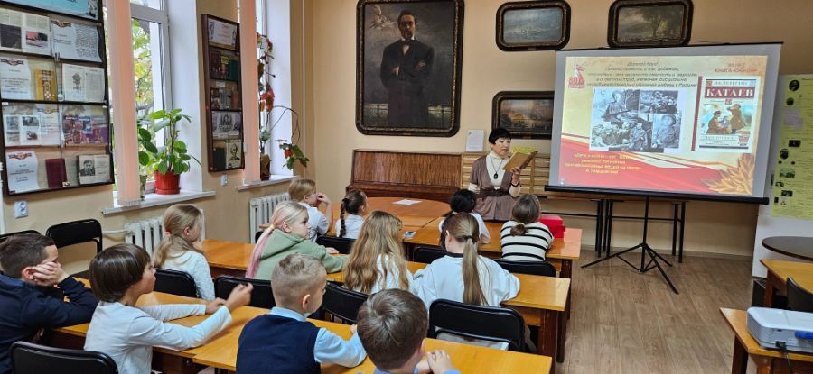 Библиотекари ознакомили ребят со слайд-презентацией «Книга - ровесница Великой Победы» по произведению Валентина Катаева «Сын полка». Книга «Сын полка», увидевшая свет в победный 1945 год, отмечает своё 80-летие в Год памяти и славы.