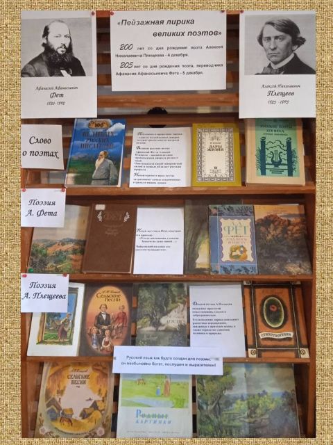 К 200-летию и 205-летию со дня рождения великих русских поэтов А.А.Фета и А.Н. Плещеева, посвятивших свои произведения природе родного края и показавших, какой невероятной силой и мощью обладает русская природа, библиотека-филиал № 23 имени С.В.Руданского подготовила выставку-вернисаж "Пейзажная лирика великих поэтов".