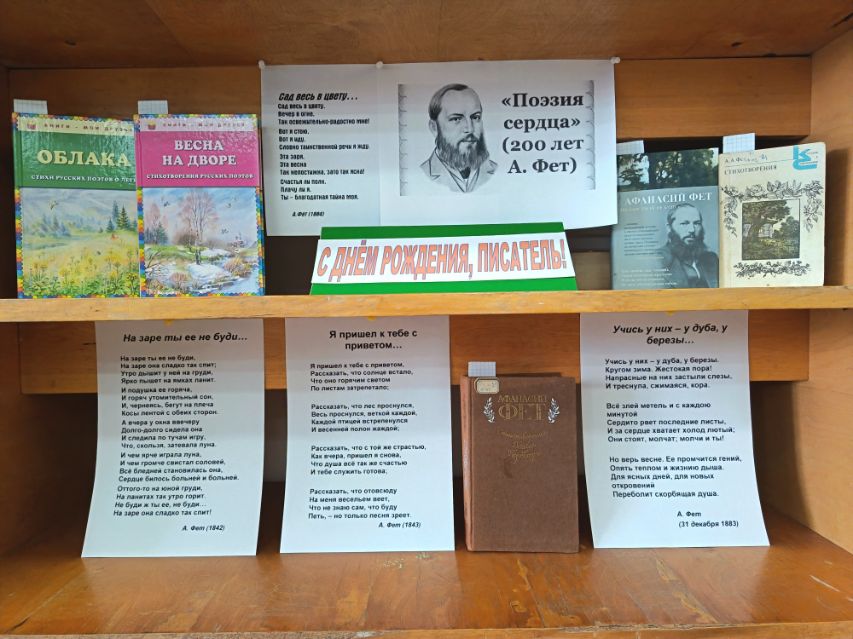 В библиотеку-филиал № 21 (пгт. Форос) пригласили читателей для участия в поэтическом марафоне чтения "Поэзия сердца Афанасия Фета", посвящённый 200-летию со дня рождения русского поэта-лирика, переводчика, мемуариста, члена-корреспондента Петербургской Академии Наук. К мероприятию подготовили книжную выставку со сборниками стихов поэта.