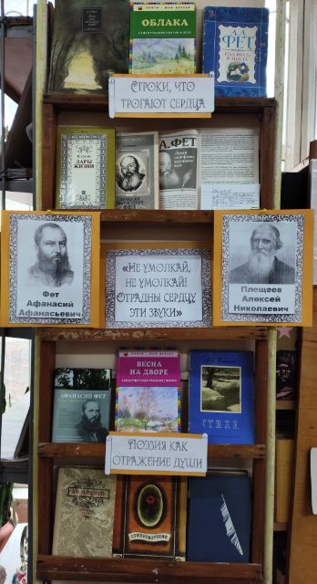 На выставке для детей представлены сборники стихов «Весна на дворе» и «Облака», А.Н. Плещеев «Стихи», А.А. Фет «Сад весь в цвету». Читателям старшего поколения предлагаем познакомиться с биографией и творчеством А.А. Фета, прочитав книгу Е.А. Маймина «Афанасий Афанасьевич Фет», а также найти любимые поэтические строки на страницах книг А.Н. Плещеева «Стихотворения» и Афанасия Фета «На заре ты её не буди...».