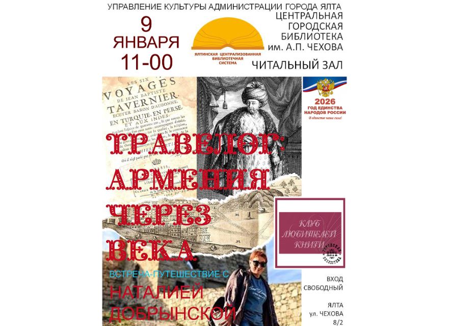 В Год единства народов России 9 января в 11:00 в читальном зале Центральной городской библиотеки имени А.П. Чехова состоится первая встреча в Клубе любителей книги с участием Наталии Добрынской, ялтинского журналиста и краеведа. Встреча-путешествие "Травелог: Армения через века" будет посвящена одному из древнейших народов России и Крыма.