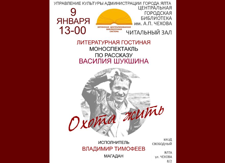9 января в 13:00 в читальном зале Центральной городской библиотеки имени А.П. Чехова состоится встреча в Литературной гостиной с Владимиром Тимофеевым, чтецом, лауреатом городских и региональных конкурсов чтецов, который представит моноспектакль по рассказу Василия Шукшина "Охота жить".