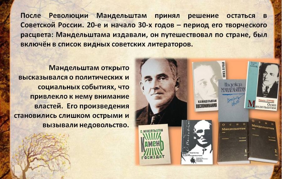 С 1925 по 1930 годы, О. Мандельштам вообще не писал стихотворений, после 1928-го - не издавал сборников своей лирики, перебиваясь переводами и редкими публикациями. Однако, «шум времени» не заглушил волшебную музыку его строк и читатели до сих пор с удовольствием вспоминают его стихи.