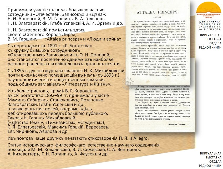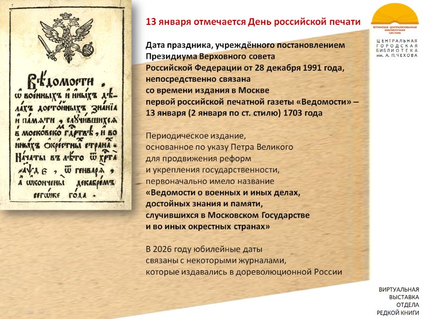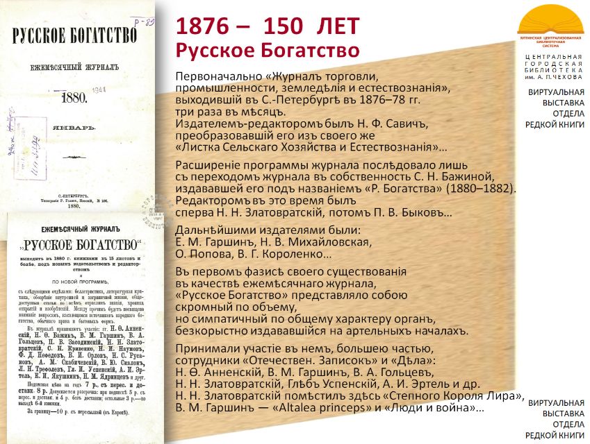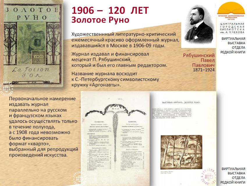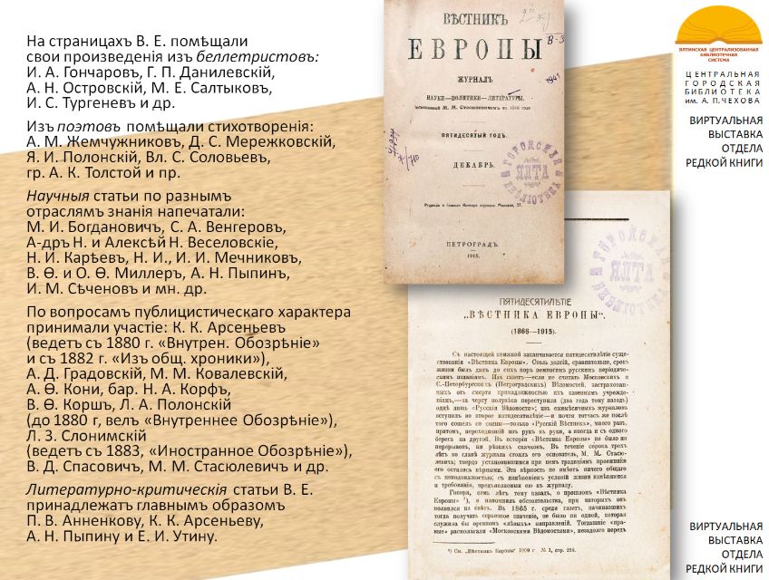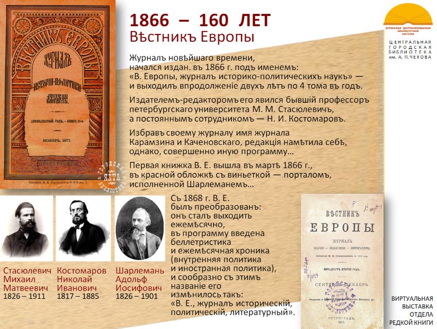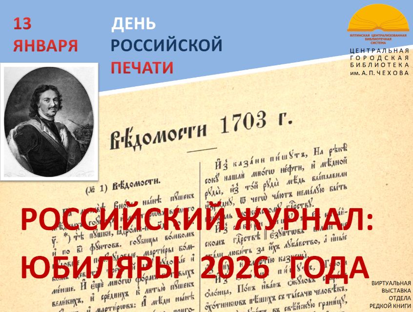 Ко Дню российской печати отдел редкой книги Центральной городской библиотеки имени А.П. Чехова подготовил виртуальную выставку "Российский журнал: юбиляры 2026 года". В 2026 году исполняется 160 лет журналу "Вестник Европы" (1866-1917), 150 лет журналу "Русское богатство" (1876-1917) и 120 лет журналу "Золотое руно" (1906-1909).