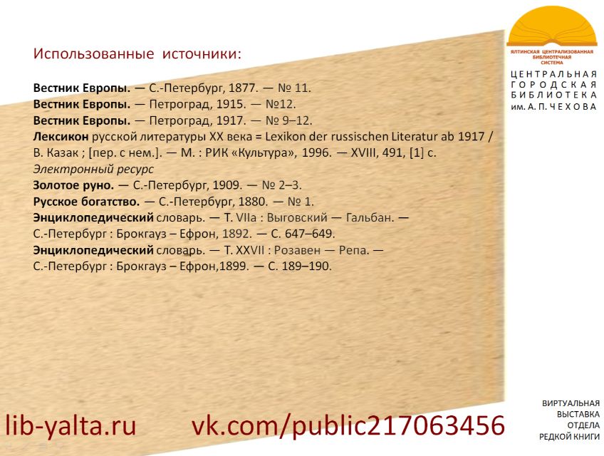 С выставкой можно ознакомиться также на странице «Ялтинская централизованная библиотечная система» социальной сети «ВКонтакте»: https://vk.com/public217063456