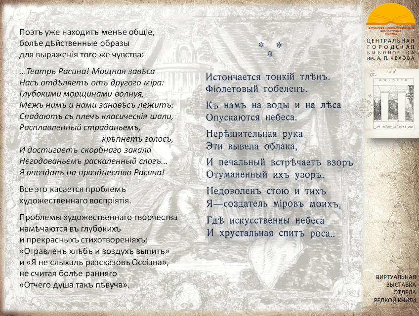 Н.С. Гумилёв: «Силой вещей, как горожанин, он стал поэтом современного города, хотя и не дивится, как заезжий пошехонец, автомобилям и трамваям и, заходя в библиотеку, не вздыхает о том, сколько написали люди, а прямо берёт нужную книгу…».