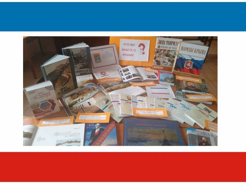 В читальном зале Центральной городской библиотеки имени А.П. Чехова представлена выставка-викторина ко Дню Республики Крым. Библиотекари подготовили подборку книг по истории, этнографии, религии, туризму, архитектуре, живописи и поэзии о Крыме и разработали вопросы для самопроверки, с помощью которых можно освежить в памяти или узнать интересные факты о Крымском полуострове.