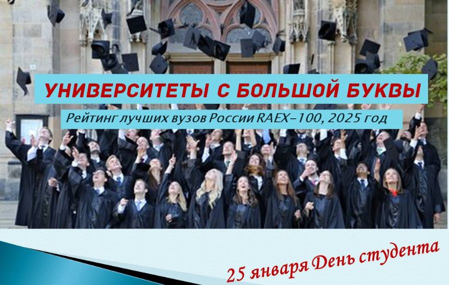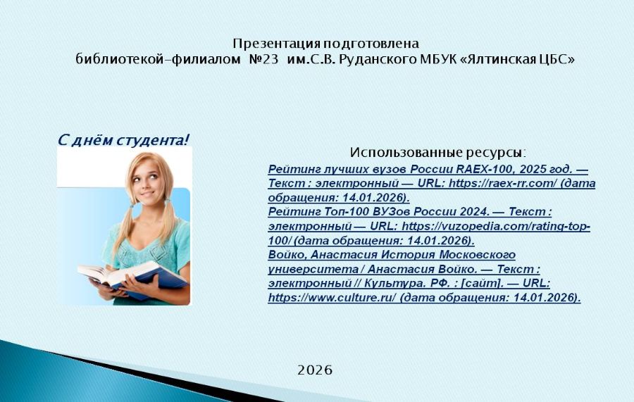 Праздник День студента учреждён Указом Президента РФ № 76 от 25 января 2005 года, но свою историю и традиции ведёт ещё с 18 века. Ко Дню студента библиотека-филиал № 23 имени С.В.Руданского подготовила виртуальную историческую информину "Университеты с большой буквы". Презентация знакомит с рейтингом лучших вузов России RAEX-100 в 2025 году.