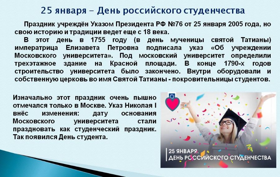 Дату основания Московского университета стали праздновать как студенческий праздник - так появился День студента.