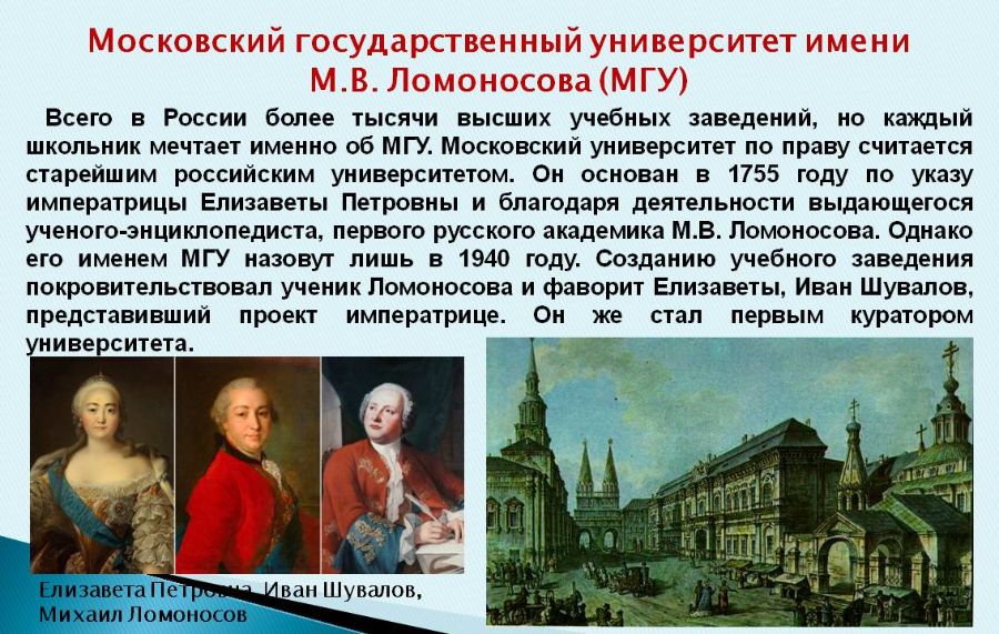 В 1755 году (в день мученицы святой Татианы) императрица Елизавета Петровна подписала указ «Об учреждении Московского университета». Под московский университет определили трёхэтажное здание на Красной площади.