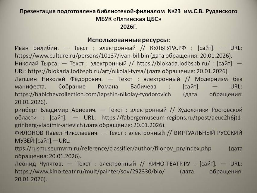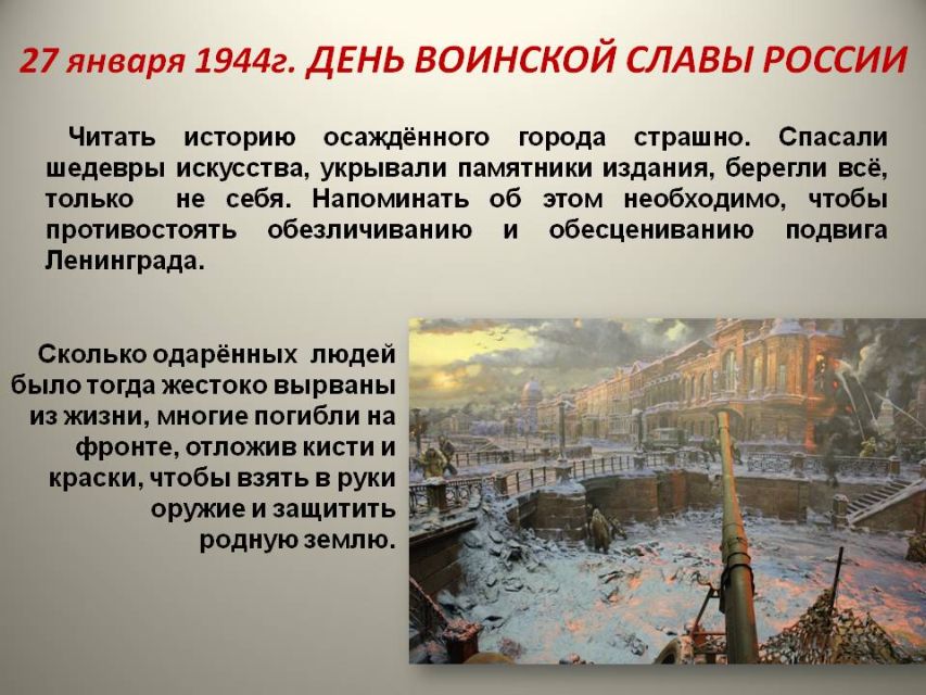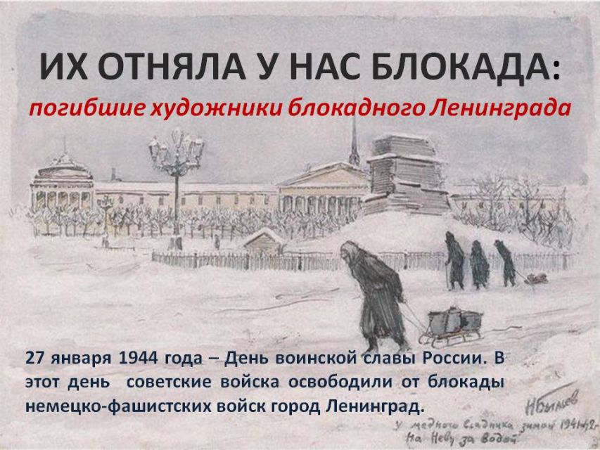 Ко Дню воинской славы России - освобождению от блокады немецко-фашистских войск города Ленинграда советскими войсками 27 января 1944 года - библиотека-филиал № 23 имени С.В.Руданского подготовила виртуальную историческую справку "Их отняла у нас блокада: погибшие художники блокадного Ленинграда".