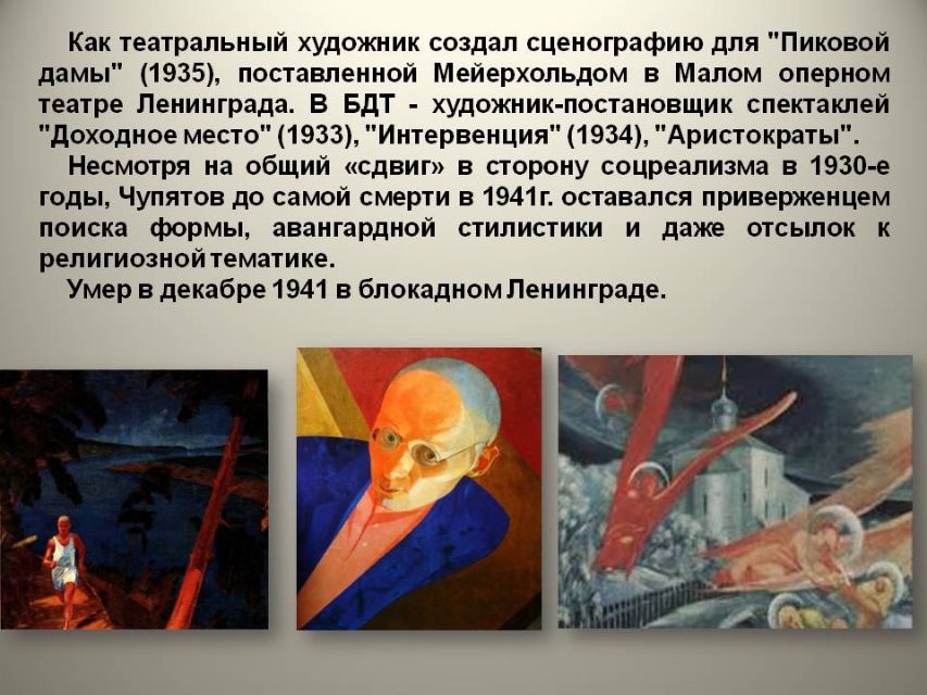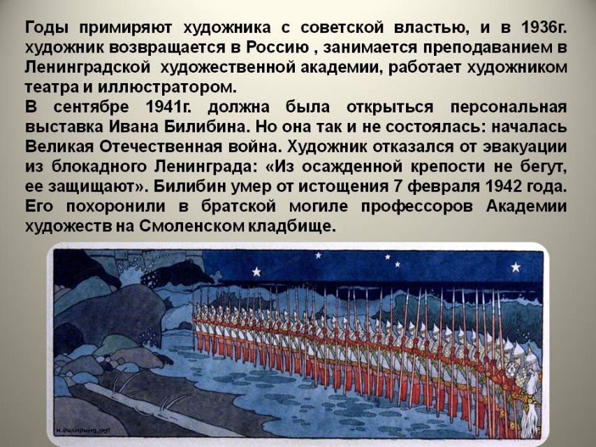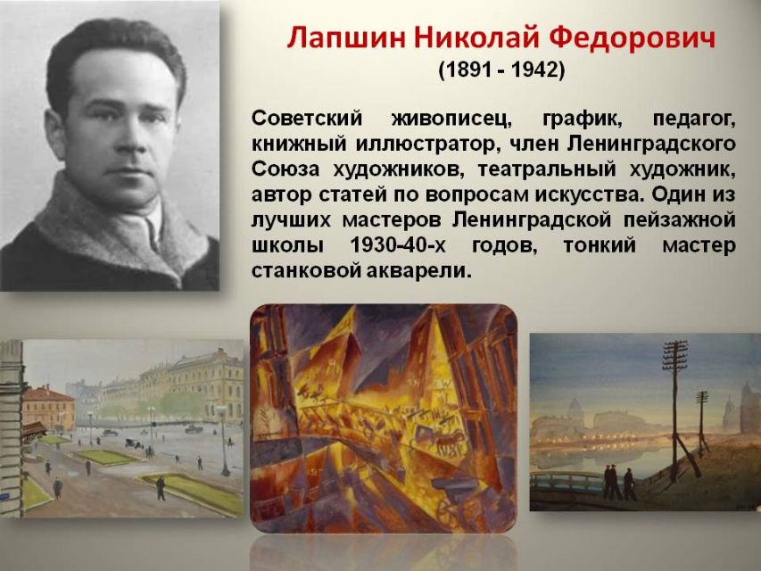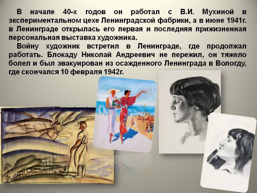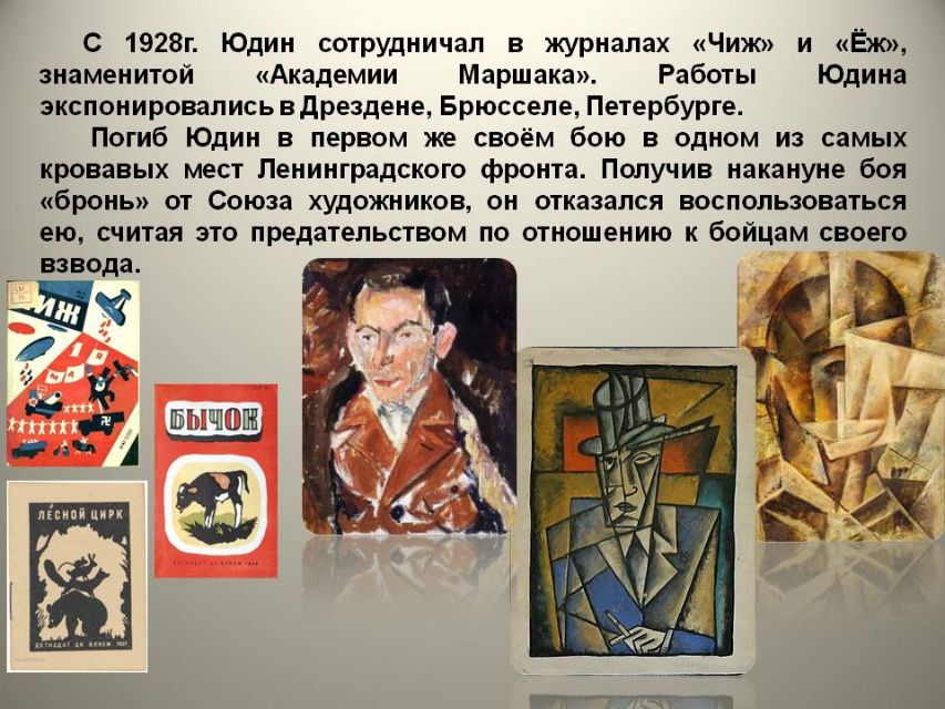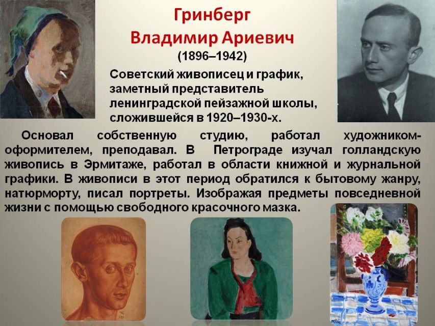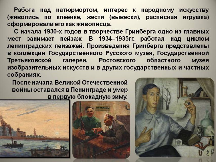 Сколько одарённых людей были тогда жестоко вырваны из жизни, многие погибли на фронте, отложив кисти и краски, чтобы взять в руки оружие и защитить родную землю. Презентация познакомит с художниками, погибшими в блокаду Ленинграда.