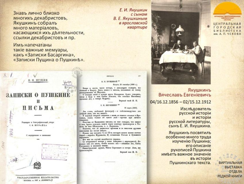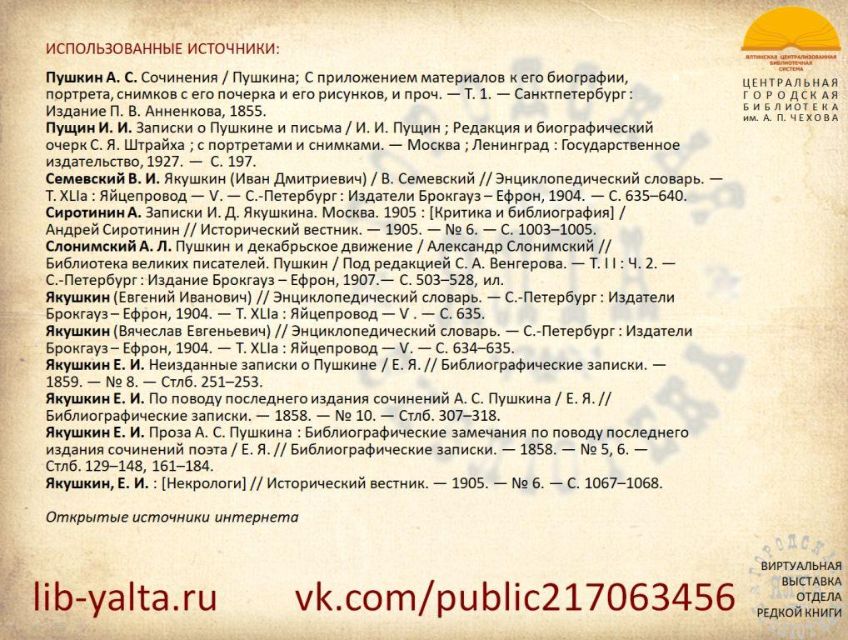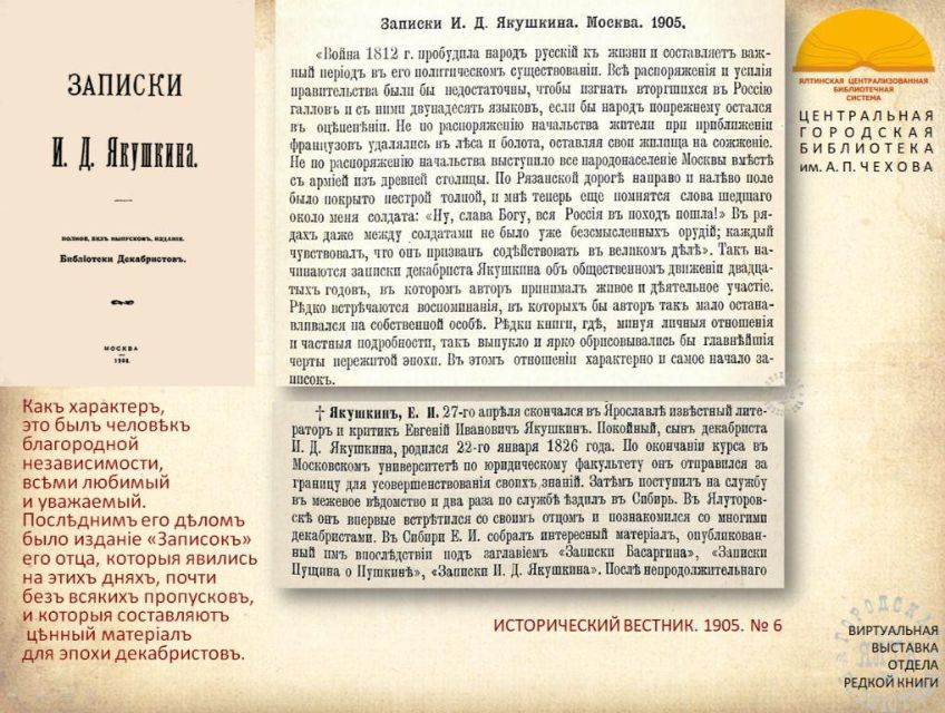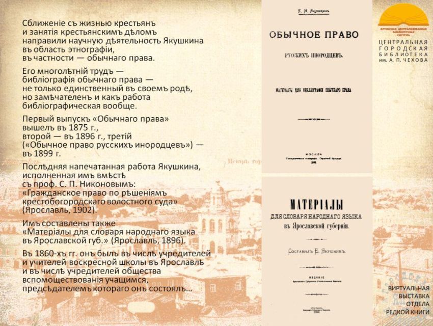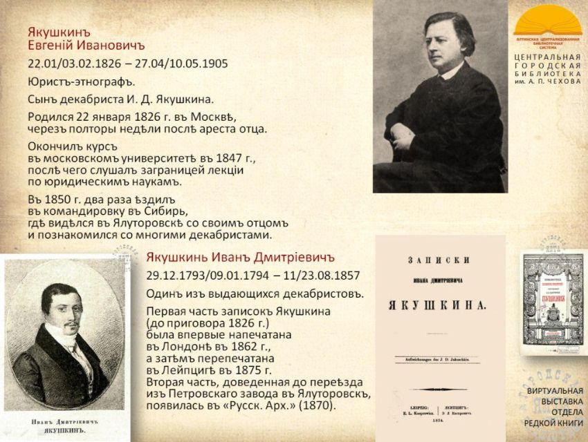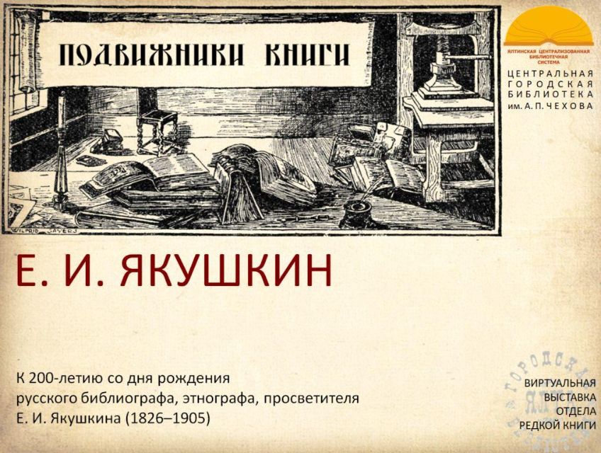 К 200-летию со дня рождения русского библиографа, этнографа и просветителя Евгения Ивановича Якушкина отдел редкой книги ЦГБ имени А.П. Чехова представляет виртуальную выставку из цикла "Подвижники книги 2026". С выставкой можно ознакомиться также на странице "Ялтинская централизованная библиотечная система" социальной сети "ВКонтакте": https://vk.com/public217063456