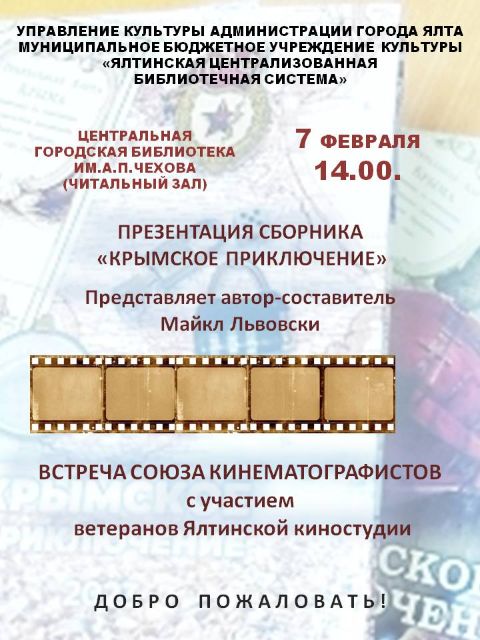 7 февраля в 14:00 в читальном зале Центральной городской библиотеки имени А.П. Чехова состоится презентация очередного выпуска сборника "Крымское приключение" и встреча членов Союза кинематографистов с участием ветеранов Ялтинской киностудии. Десятый выпуск сборника "Крымское приключение 2024" представит его автор-составитель Майкл Львовски, писатель, журналист, киноэксперт.