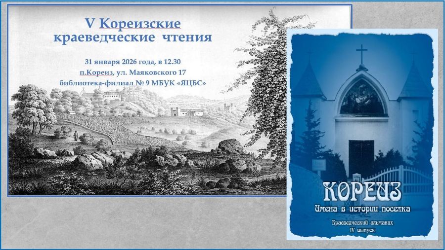 "Времён связующая нить" - так называется вступительная статья альманаха "Кореиз: имена в истории посёлка", к презентации которого было приурочено проведение V юбилейных Краеведческих чтений в библиотеке-филиале № 9 (пгт. Кореиз). На чтения пригласили учёных, краеведов, деятелей литературы и искусства - авторов статей альманахов и литературно-краеведческих календарей, выпускаемых по инициативе библиотеки.