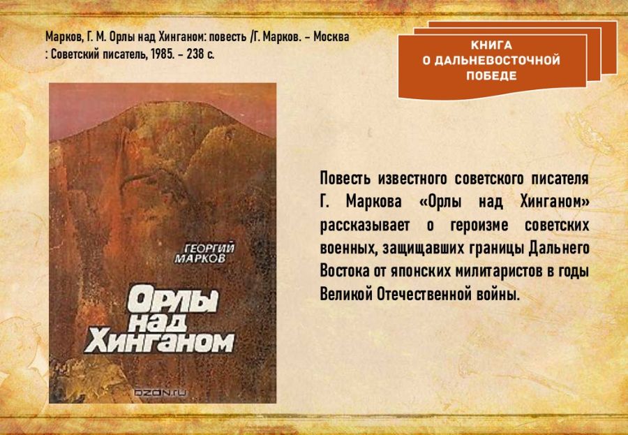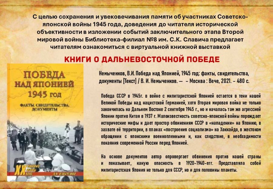 Виртуальные читатели могут ознакомиться с подборкой книг, каждая из которых раскрывает разные аспекты русско-японских отношений. Книга В.И. Немыченкова «Победа над Японией, 1945 год: факты, свидетельства, документы» разбирает мифы о советско-японской войне 1945 года.