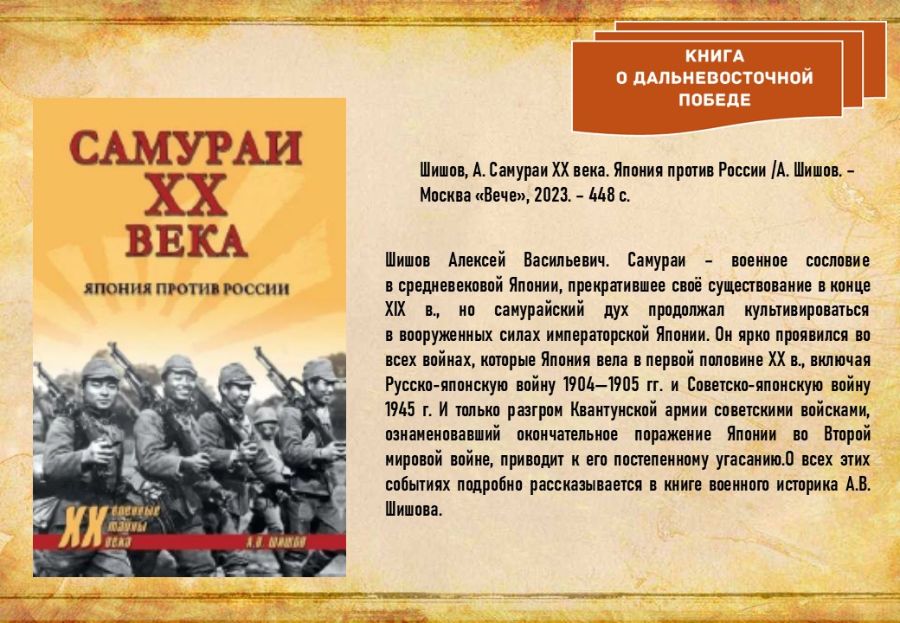 А.В. Шишов «Самураи ХХ века. Япония против России». Рассказывает о «самурайском духе», который проявлялся в военных конфликтах Японии в первой половине XX века, включая Русско-японскую войну 1904-1905 гг. и Советско-японскую войну 1945 г. Описывает разгром Квантунской армии - ключевое событие, ознаменовавшее поражение Японии во Второй мировой войне.