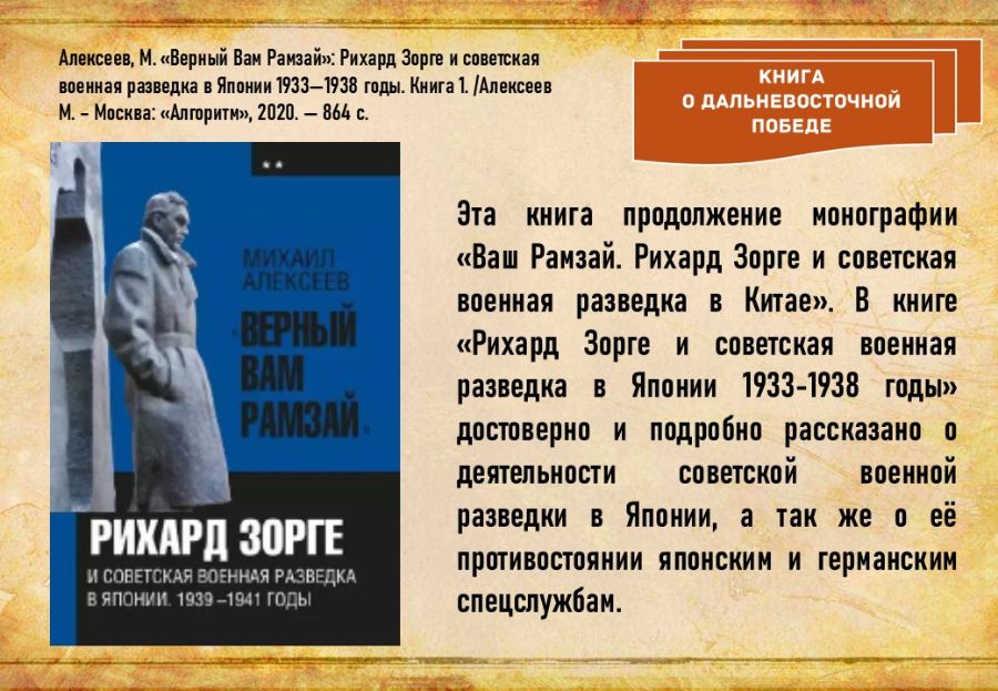 Книга М. Алексеева «Верный Вам Рамзай: Рихард Зорге и советская военная разведка в Японии. 1933-1938 годы» посвящена деятельности легендарного разведчика Рихарда Зорге в Японии накануне Второй мировой войны.