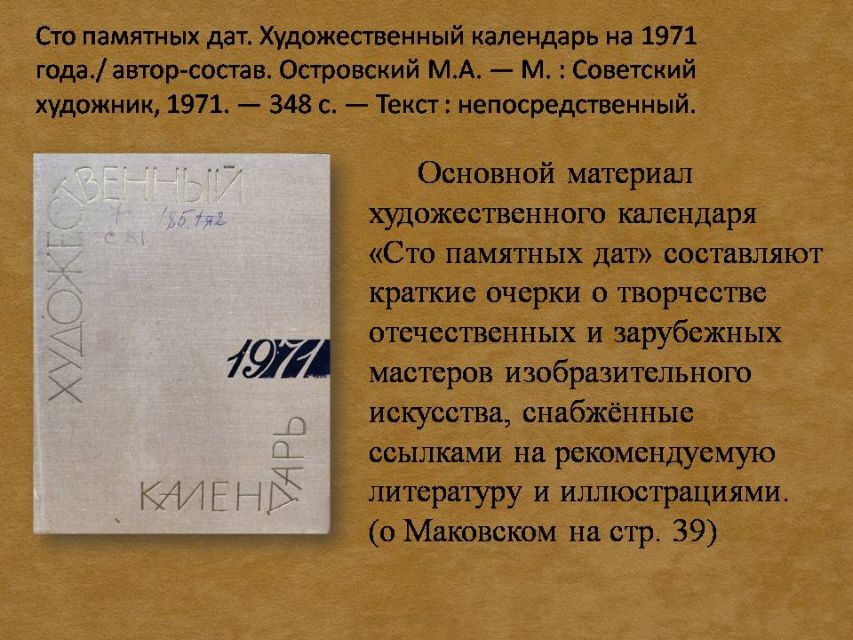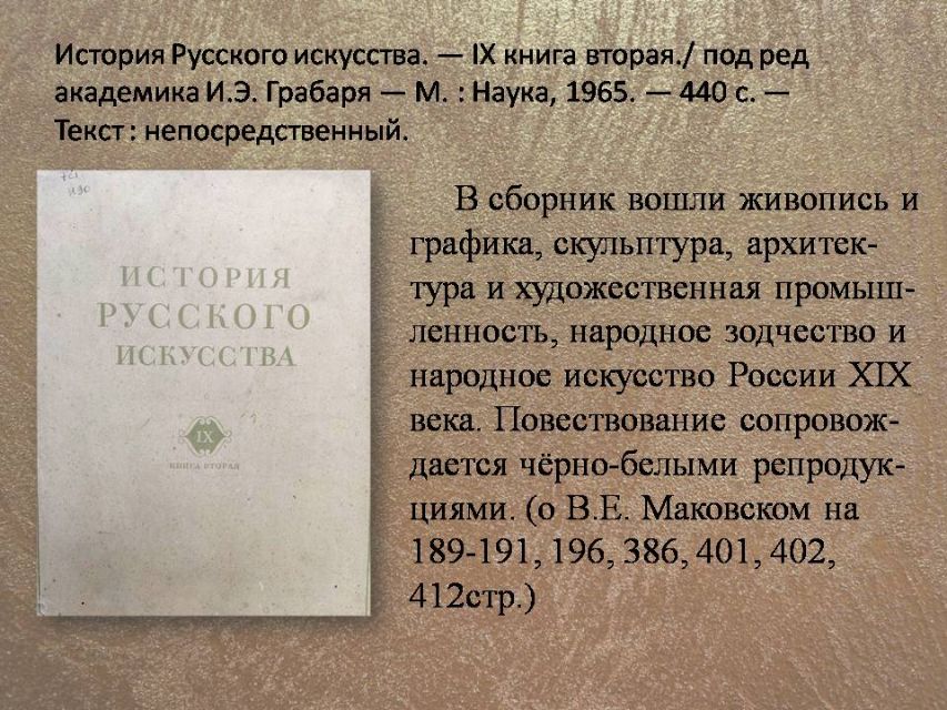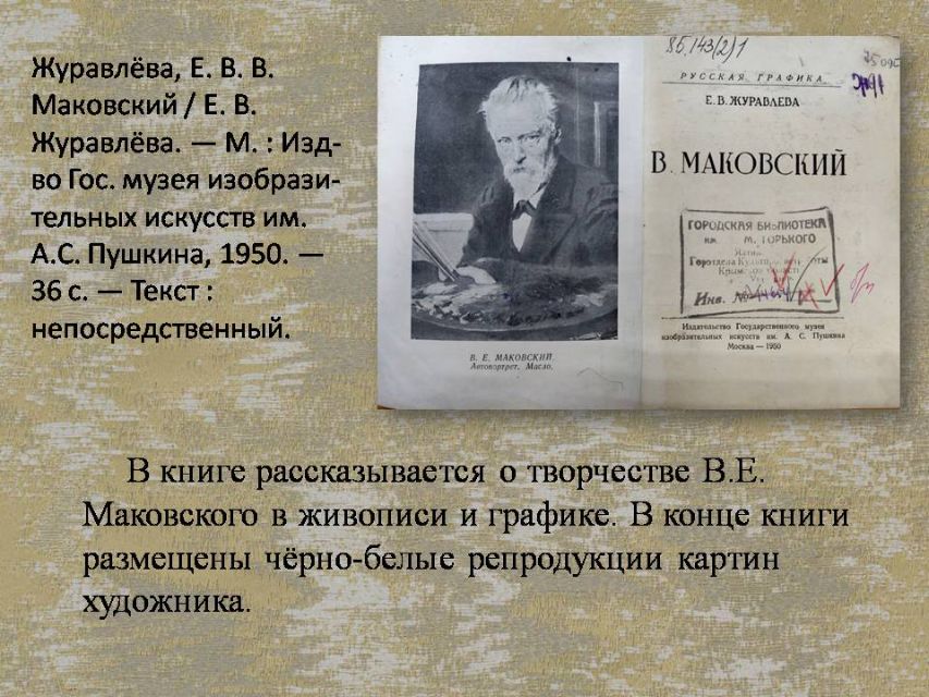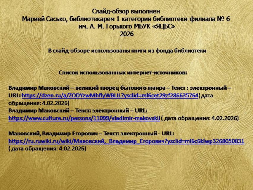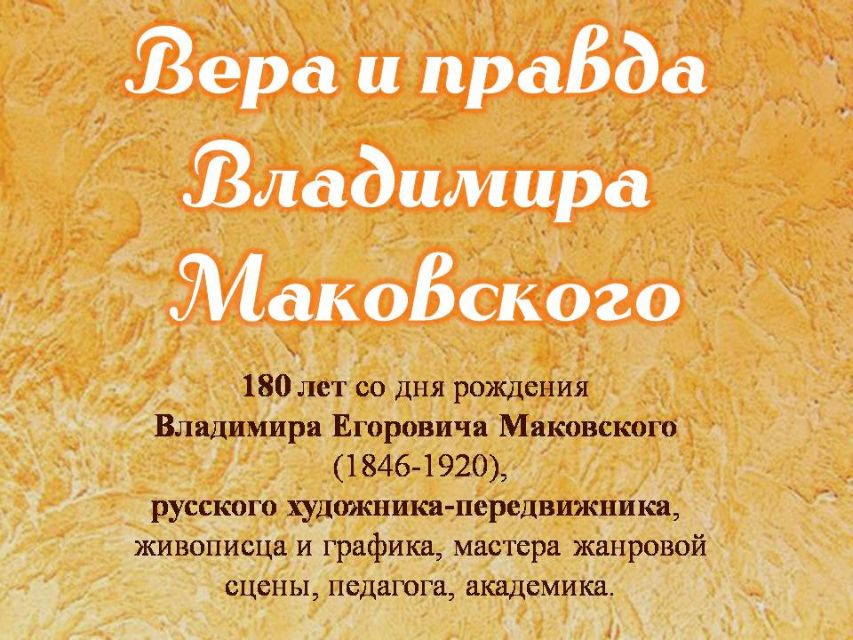 7 февраля 1846 года родился Владимир Егорович Маковский, живописец, член товарищества передвижников, академик и действительный член Императорской Академии художеств. К этому дню библиотека-филиал № 6 имени А.М.Горького подготовила виртуальный обзор "Вера и правда Владимира Маковского", где представлены картины художника и литература из фонда библиотеки.