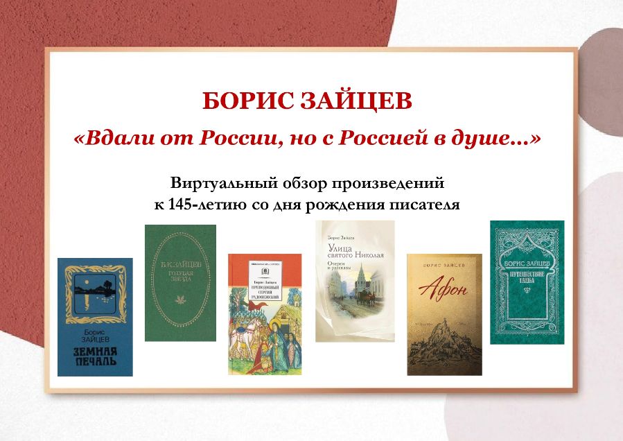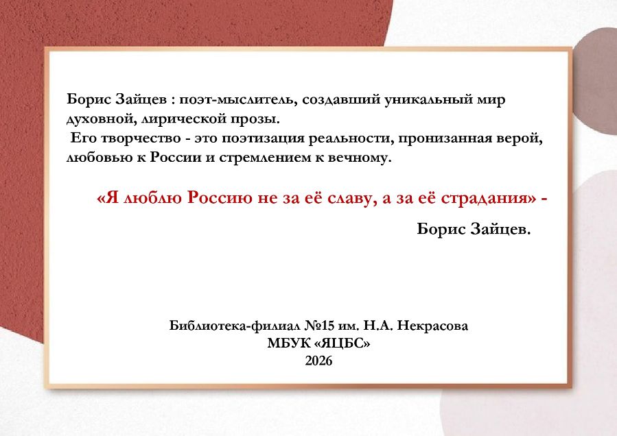 Библиотека-филиал № 15 имени Н.А.Некрасова (г. Алупка) приглашает познакомиться с виртуальным обзором произведений выдающегося русского писателя Серебряного века Бориса Константиновича Зайцева "Вдали от России, но с Россией в душе…", приуроченным к юбилейной дате. Откройте для себя писателя, чья душа, как и творчество, навсегда осталась в России!