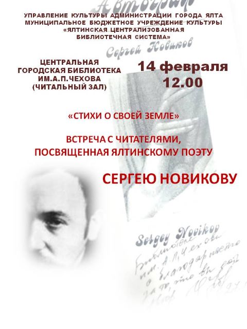 14 февраля в 12:00 в читальном зале Центральной городской библиотеки имени А.П. Чехова состоится встреча с читателями "Стихи о своей земле", посвящённая памяти Сергея Леонидовича Новикова, известного и талантливого ялтинского поэта, лауреата литературной премии им. А.П. Чехова. Встреча приурочена к 75-летию со дня рождения поэта.