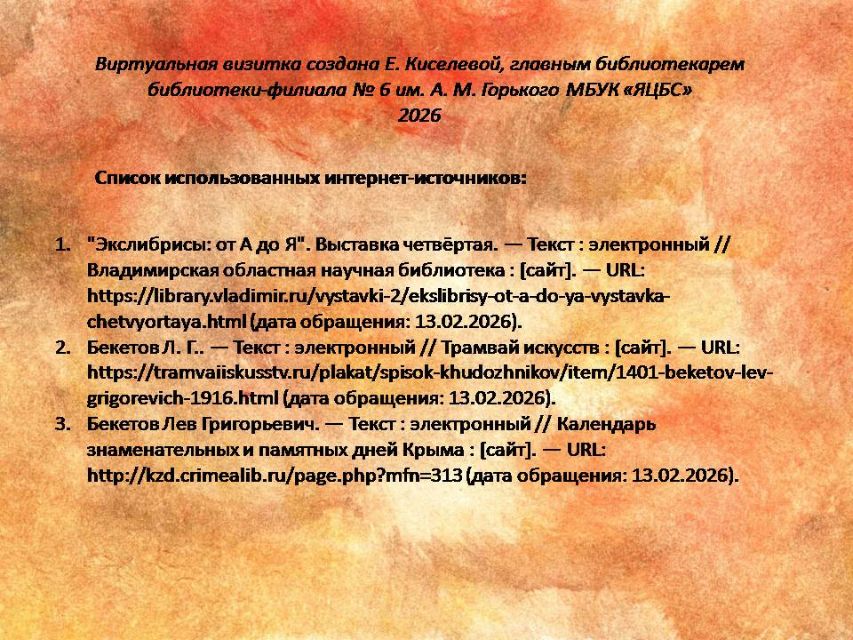 110 лет исполнилось со дня рождения крымского художника-графика Льва Григорьевича Бекетова, организатора и участника выставок экслибриса в Крыму и других регионах России. Этому событию библиотека-филиал № 6 имени А.М.Горького посвятила виртуальную визитку, которая знакомит читателей с творчеством художника.