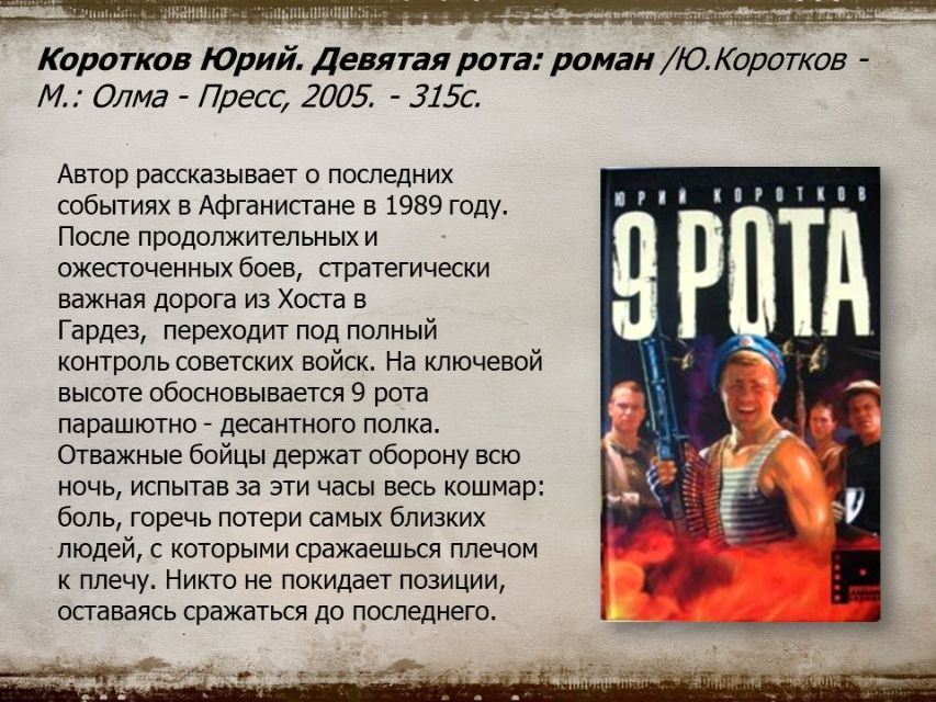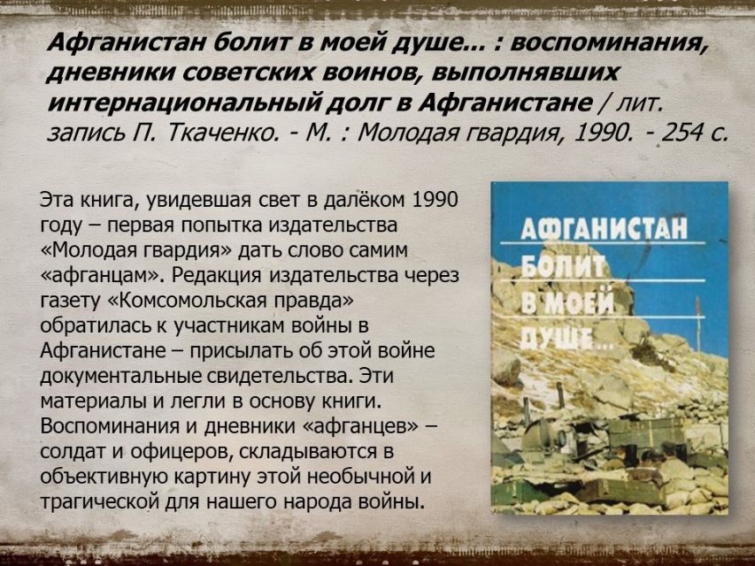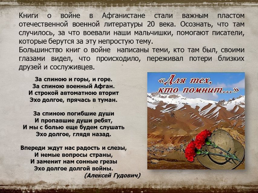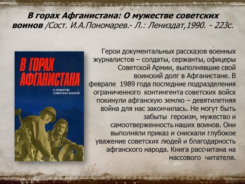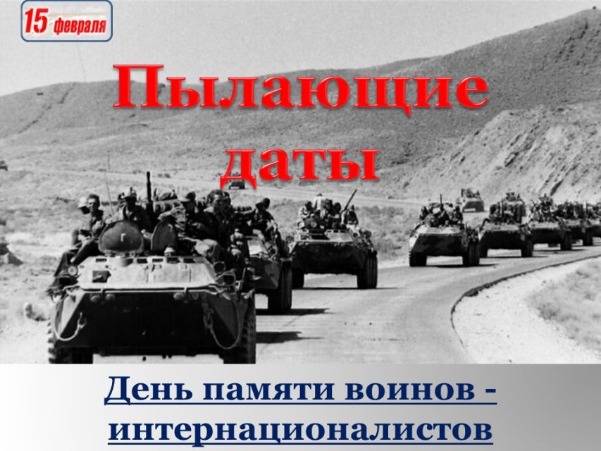 Ко Дню памяти воинов-интернационалистов Юношеская библиотека-филиал № 25 подготовила для читателей виртуальный книжный обзор "Пылающие даты", в котором представлены книги, помогающие понять, что пережили воины-интернационалисты, сохранить память и выразить уважение.