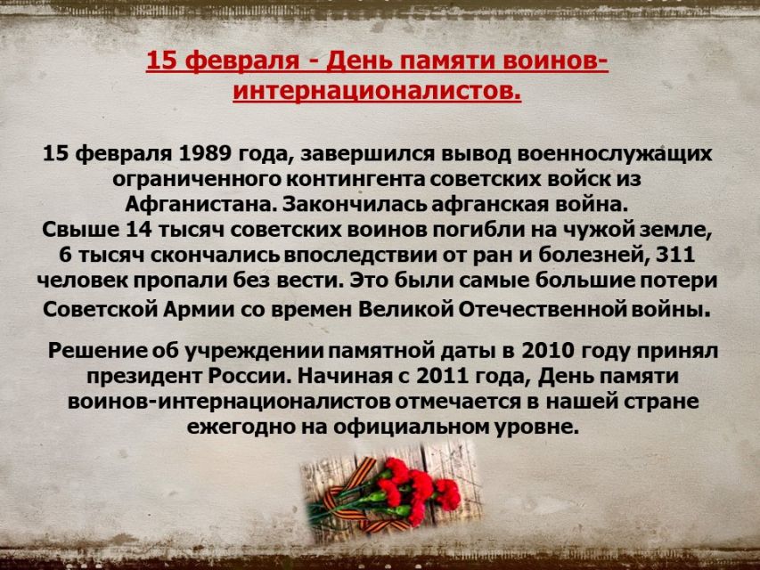 С 2011 года эта дата официально отмечается в России как День памяти о тех, кто исполнял служебный долг за пределами Отечества. Их служба была часто невидимой для соотечественников, а подвиги - засекреченными.