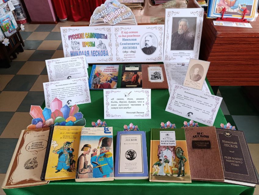 В библиотеке-филиале № 26 для детей (пгт. Гурзуф) представлена книжная выставка "Русские самоцветы прозы Николая Лескова", приуроченная к 195-летию со дня рождения русского писателя. Выставка организована в рамках цикла мероприятий "Литературный календарь 2026 года: юбилеи русской словесности" и адресована школьникам, которые только начинают открывать для себя богатство русской литературы.