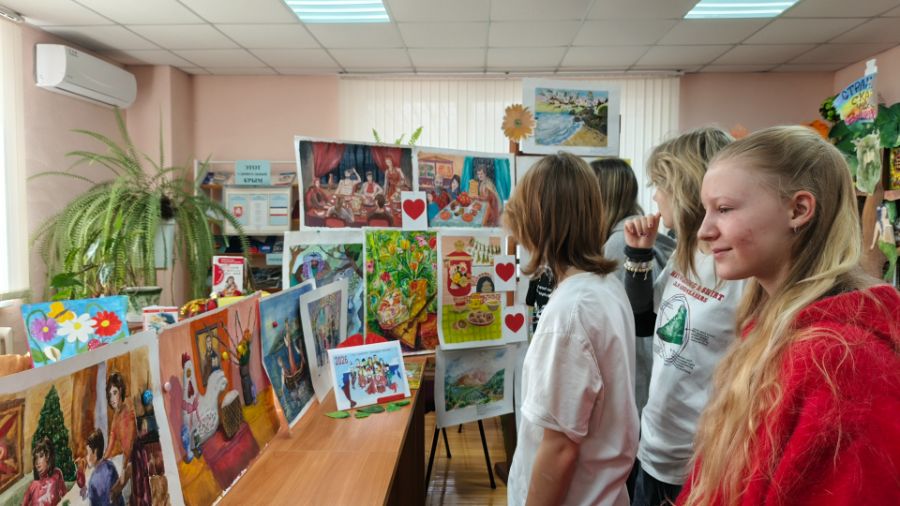 Символично, что именно в день, когда главным героем является книга, пространство библиотеки наполнилось не только литературой, но и живописью. Литературное пространство украсила красочная выставка художественных работ «Крымская палитра народов», оформленная в рамках Года единства народов России юными художниками школы.
