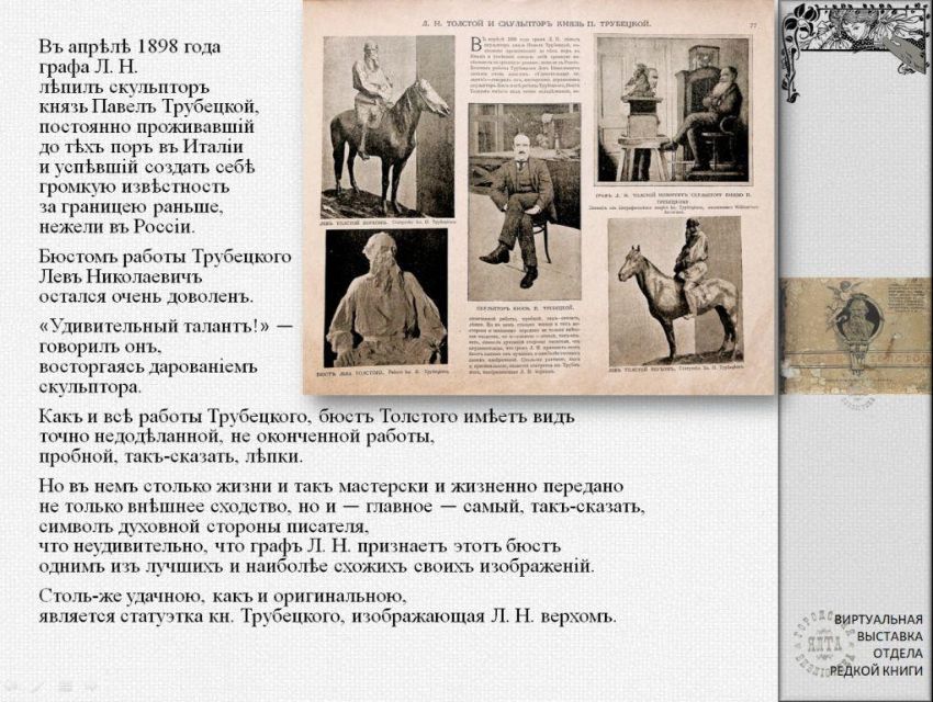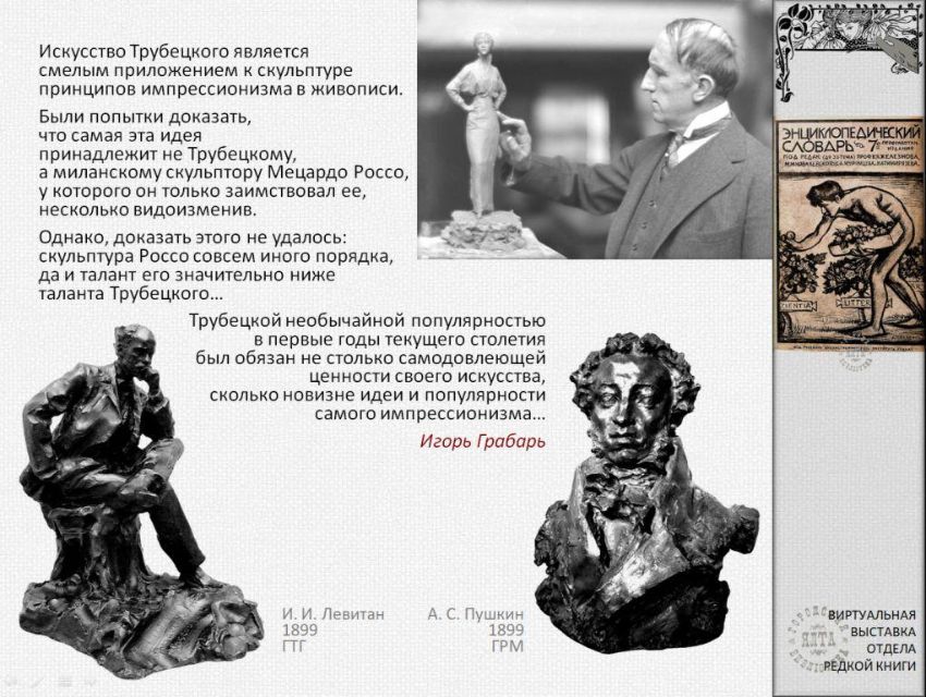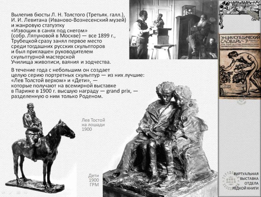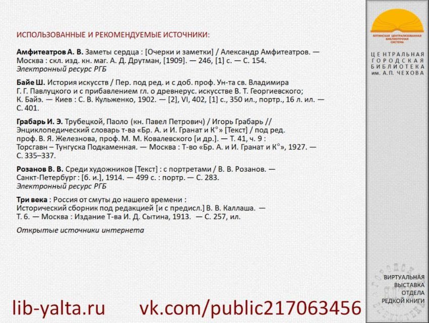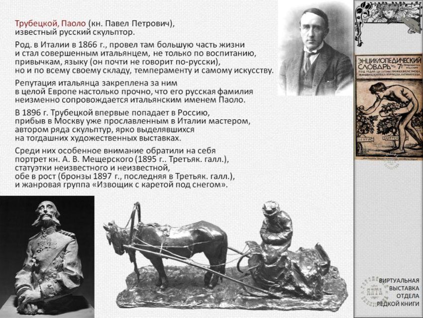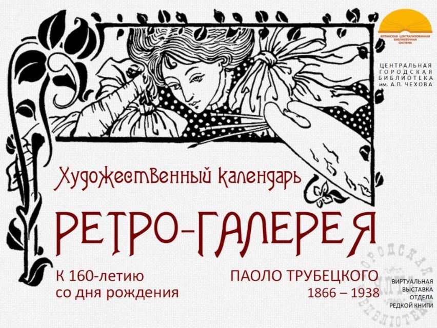 К 160-летию со дня рождения известного русского и итальянского скульптора графа Павла Петровича Трубецкого (Паоло Трубецкого) отдел редкой книги ЦГБ им. А.П. Чехова подготовил виртуальную выставку из цикла "Ретро-галерея". С выставкой можно ознакомиться также на странице "Ялтинская централизованная библиотечная система" социальной сети "ВКонтакте": https://vk.com/public217063456