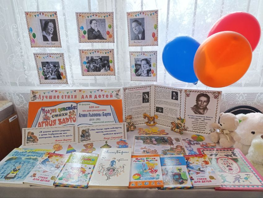Библиотекарь пригласила маленьких дошколят и их родителей в детскую библиотеку, где их ждут книги с празднично-оформленной книжной выставки «Поэзия детства: стихи Агнии Барто».