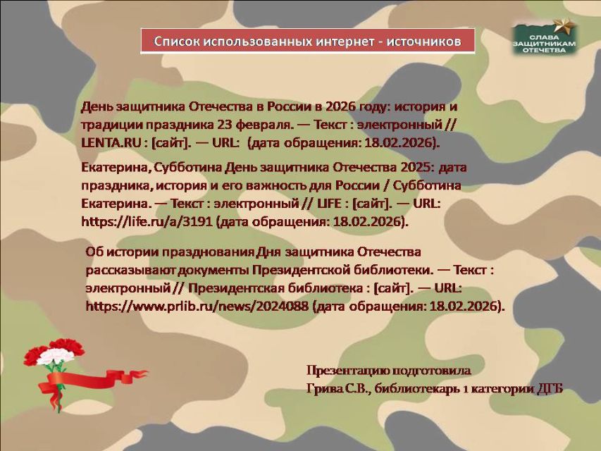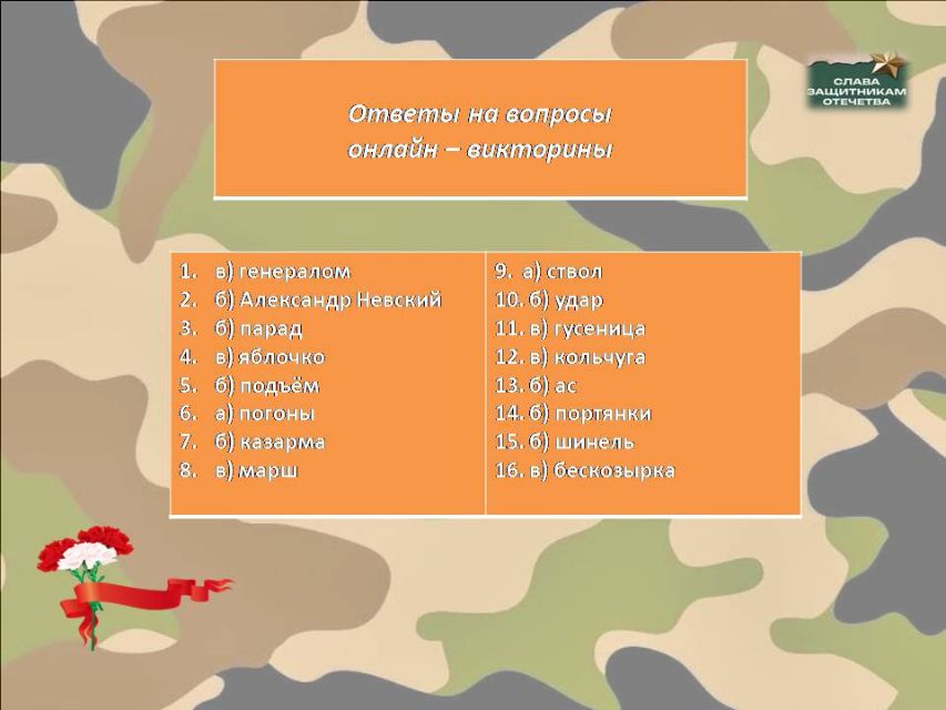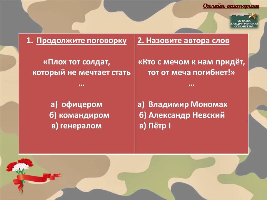 С тех пор День защитника Отечества стал символом воинской доблести, мужества и патриотизма. Викторина создана, чтобы разжечь искру любопытства. Вопросы подобраны так, чтобы было интересно и первокласснику, и ученику средней школы. Вспомните имена героев, угадайте сюжеты по описанию и проявите смекалку в нестандартных заданиях!