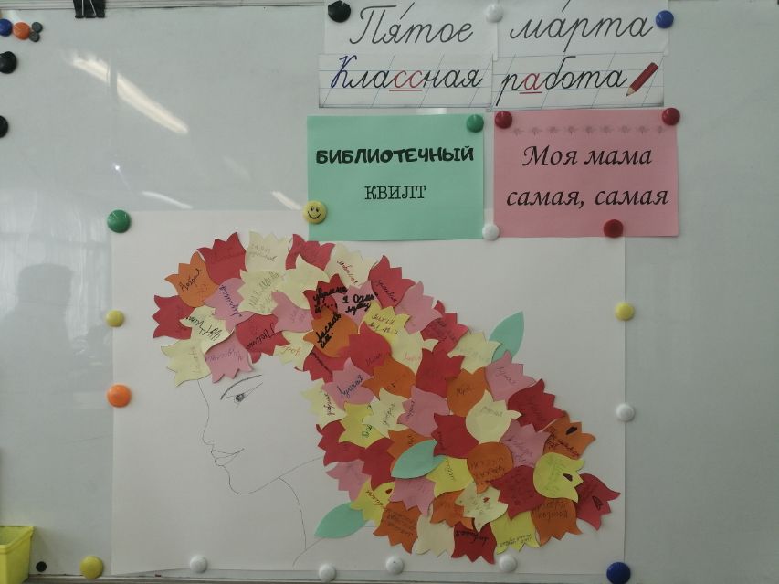В заключение мероприятия школьники оформили библиотечный квилт «Моя мама самая, самая» из трогательных слов о своих мамах.