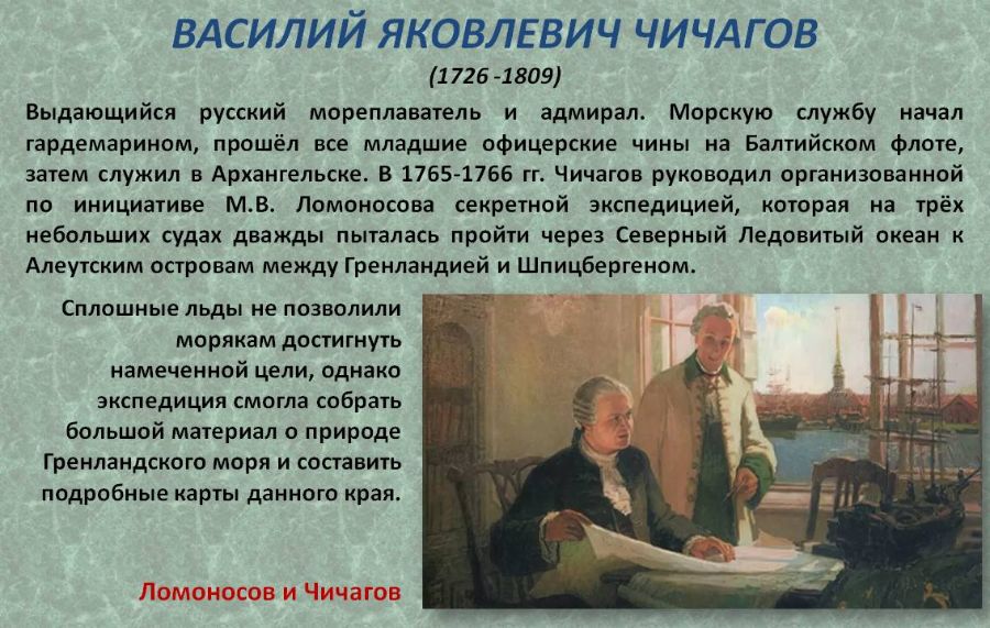 В 1765-1766 гг. В.Я. Чичагов руководил организованной по инициативе М.В. Ломоносова секретной экспедицией через Северный Ледовитый океан к Алеутским островам между Гренландией и Шпицбергеном.