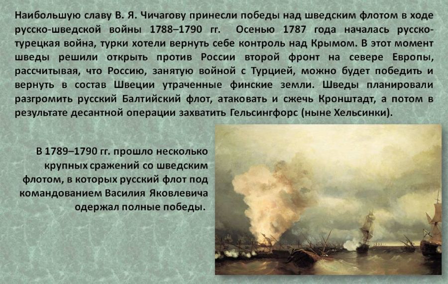 Наибольшую славу В.Я. Чичагову принесли победы над шведским флотом в ходе русско-шведской войны 1788-1790 гг.