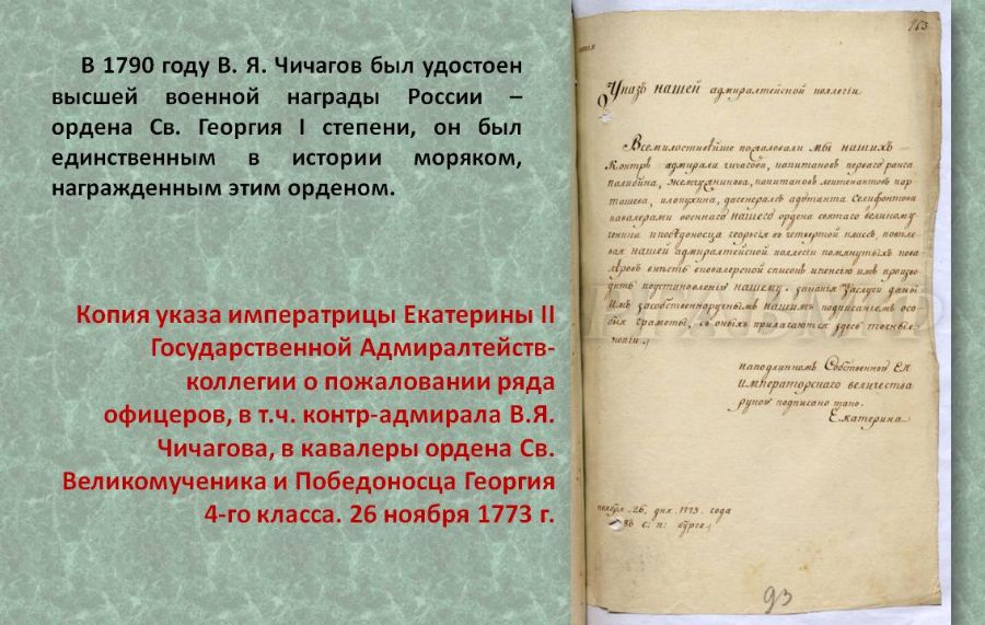 В 1790 году В.Я. Чичагов был удостоен высшей военной награды России - ордена Св. Георгия I степени, он был единственным в истории моряком, награждённым этим орденом.