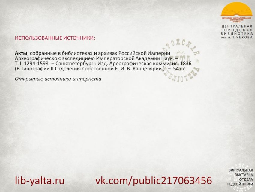 Первый том представленного редкого издания «Акты, собранные в библиотеках и архивах Российской Империи Археографическою экспедициею Императорской Академии Наук» вышел в Санкт-Петербурге в 1836 году.