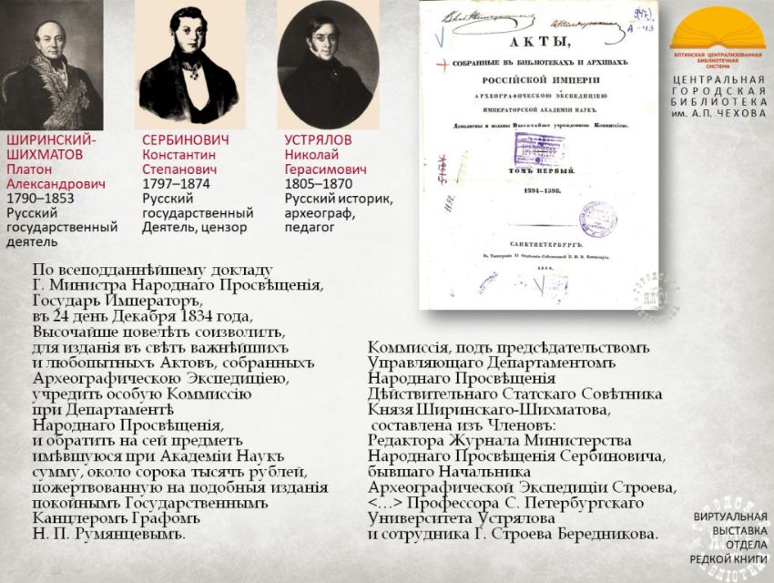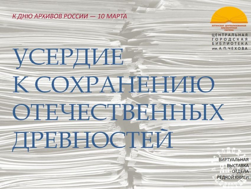 Ко Дню архивов России отдел редкой книги Центральной городской библиотеки имени А.П. Чехова подготовил виртуальную выставку "Усердие к сохранению древностей", где представлено редкое издание из личной библиотеки В.М. Жемчужникова - «Акты, собранные в библиотеках и архивах Российской Империи Археографическою экспедициею Императорской Академии Наук».