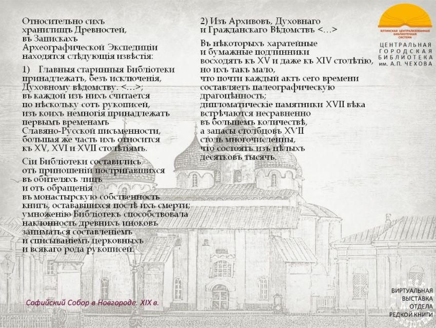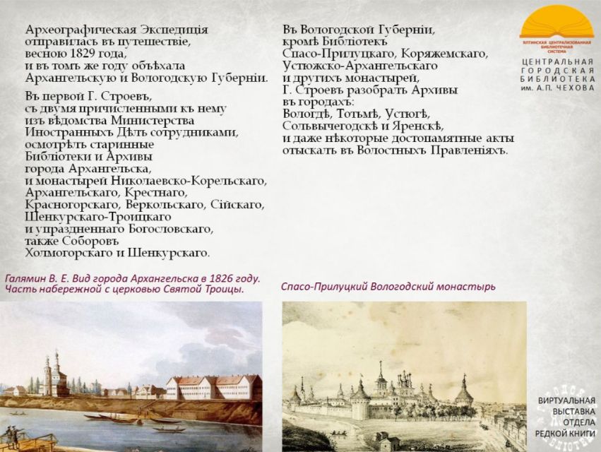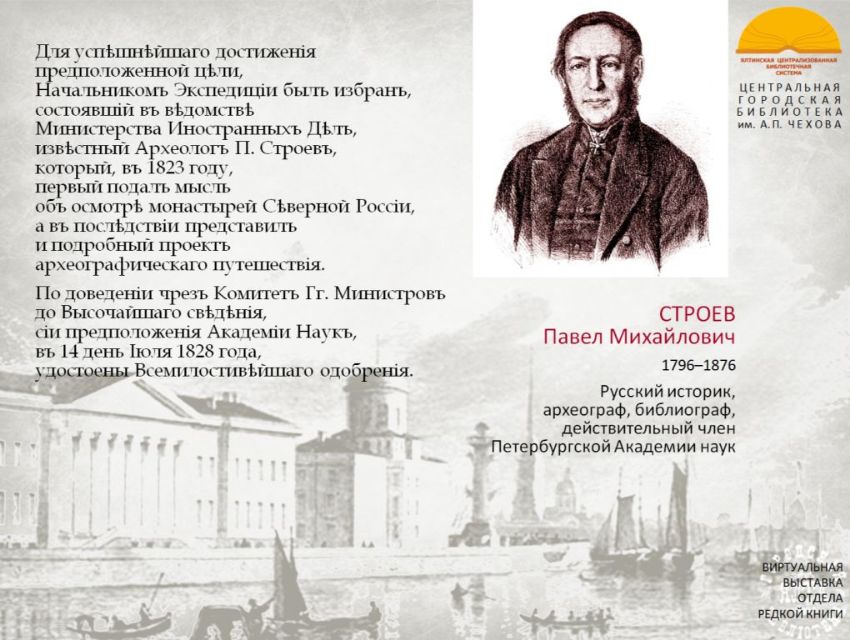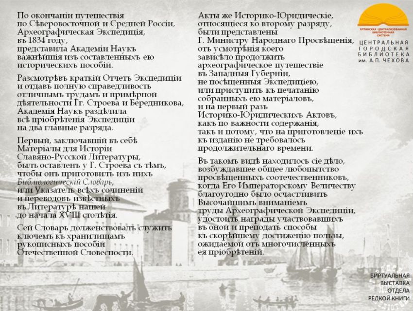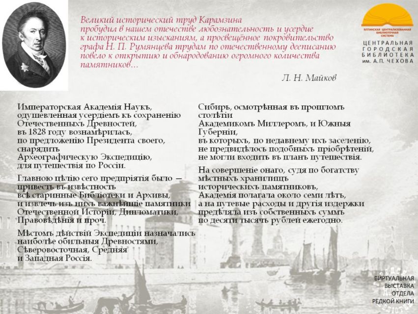 «Императорская Академия Наук, одушевленная усердием к сохранению Отечественных Древностей, в 1828 году вознамерилась, по предложению Президента своего, снарядить Археографическую Экспедицию, для путешествия по России...».